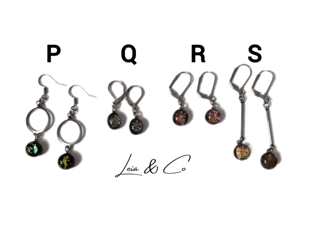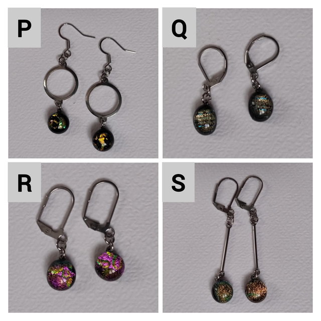 Les cabochons sont faits main, en verre dichroïque, qui est un verre spécial sont la couleur et les reflets changent en fonction de l'orientation de la lumière. Boucles en acier chirurgical (sans nickel, ne rouille pas)